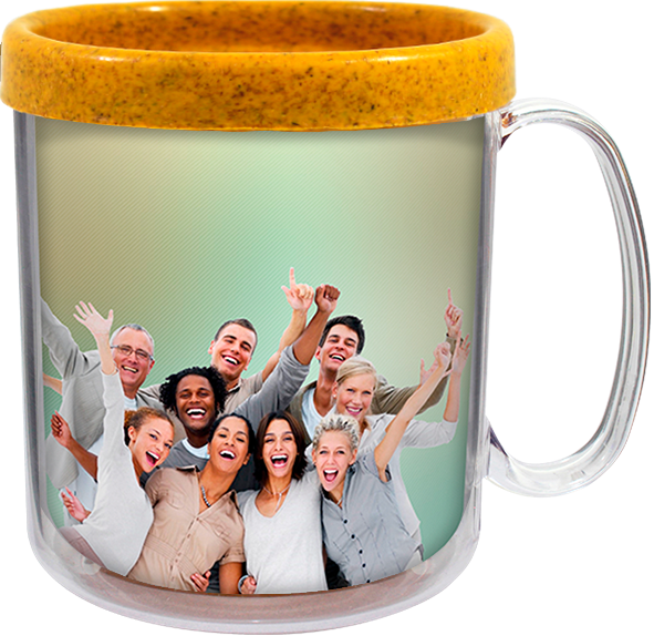 Caneca plástica, atóxica, composta por três partes, um corpo cristal transparente em Plástico Premium (PS Cristal), um refil colorido feito com 50% de fibra de madeira e 50% Plástico Premium (PP) e um refil de papel com impressão digital colorida. Dupla parede que conserva a temperatura por mais tempo e tem capacidade para 300 ml.
